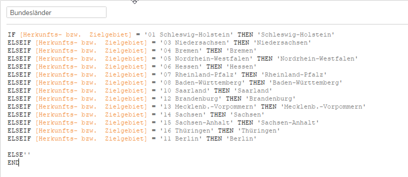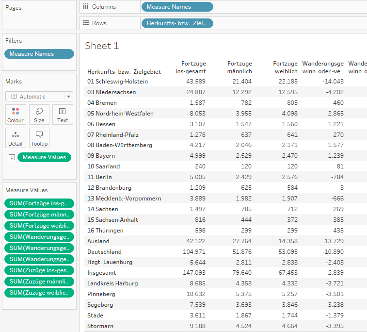 Geografische Daten sind im Tableau oft nicht leicht zu interpretieren. In meinem Fall waren die Bundesländer mit den Zahlen vorne, das sollte man korrigieren.