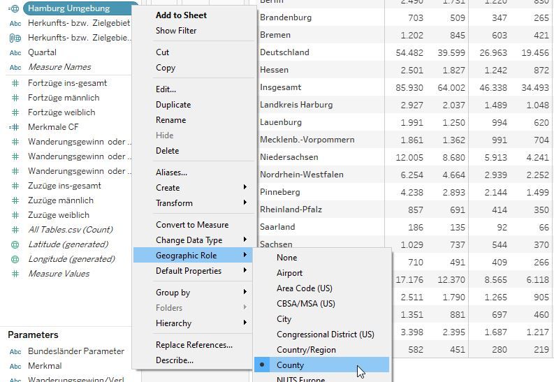 Auch die Hamburger Umgebung wollte ich getrennt haben, dafür habe ich berechnete Felder erstellt und den Datentyp für die Bundesländer auf State/Province gesetzt und für die Umgebung - County gewählt.