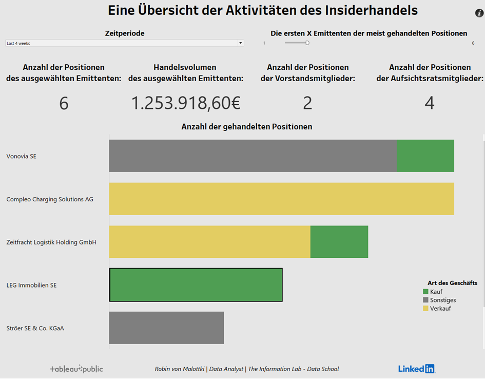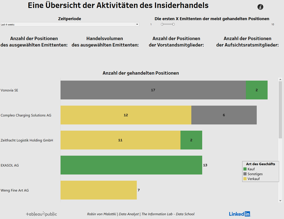 In diesem Dashboard kann man relativ zum heutigen Tag eine Zeitperiode bestimmen und die ersten X Emittenten anzeigen lassen, die absteigend im Balkendiagramm nach Summierten Positionen angezeigt werden. Bei einer Position handelt es sich um jede Transaktion, die eine Rechtspersönlichkeit durchführt.