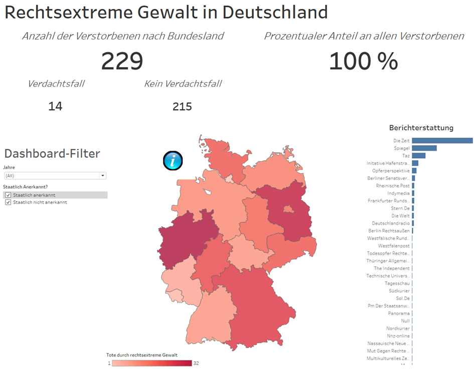 Spätestens seit der Flüchtlingskrise steigt die Präsenz rechtsextremer Gewalt in den Medien an. Die Amadeu-Antonio-Stiftung hat auf ihrer Internetseite sämtliche Informationen über die Taten, sowie Informationen über deren Opfer zusammengetragen. Mit diesen Daten habe ich ein Dashboard erstellt, mit dem man eine regionale Analyse der rechtsextremistischen Gewalt durchführen kann.