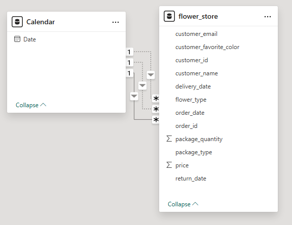 Qnty Delivered Date = CALCULATE(sum(flower_store[package_quantity]), USERELATIONSHIP('Calendar'[Date], flower_store[delivery_date]))