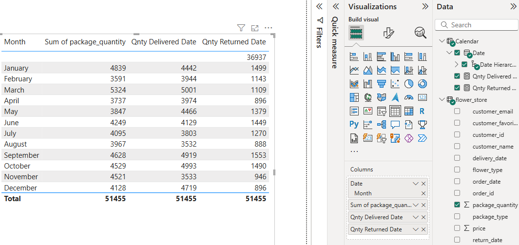 Qnty Returned Date = CALCULATE(SUM(flower_store[package_quantity]), USERELATIONSHIP('Calendar'[Date], flower_store[return_date]))