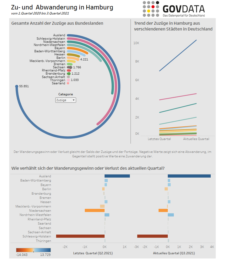 For visualization, I knew from the very beginning that I wanted to build a radial chart which I never had chance to do. I finished the chart quite fast surprisingly, which presents the share of immigrants coming to Hamburg by their original state of residence and vice versa. The second one is the slope chart which illustrates the current trend of the current quarter and last quarter, quite useful for someone who cares about the current situation and short term forecast. Because of the time constraint, the third chart of mine should be simple and clear enough to communicate the message, which addressed the net effect of immigration and migration of Hamburg city (more people moving into or out of the city). After a while of trying and failing with different chart types, I decided to simply go with a table. I knew for certain, someone out there would definitely love to see a couple of numbers.