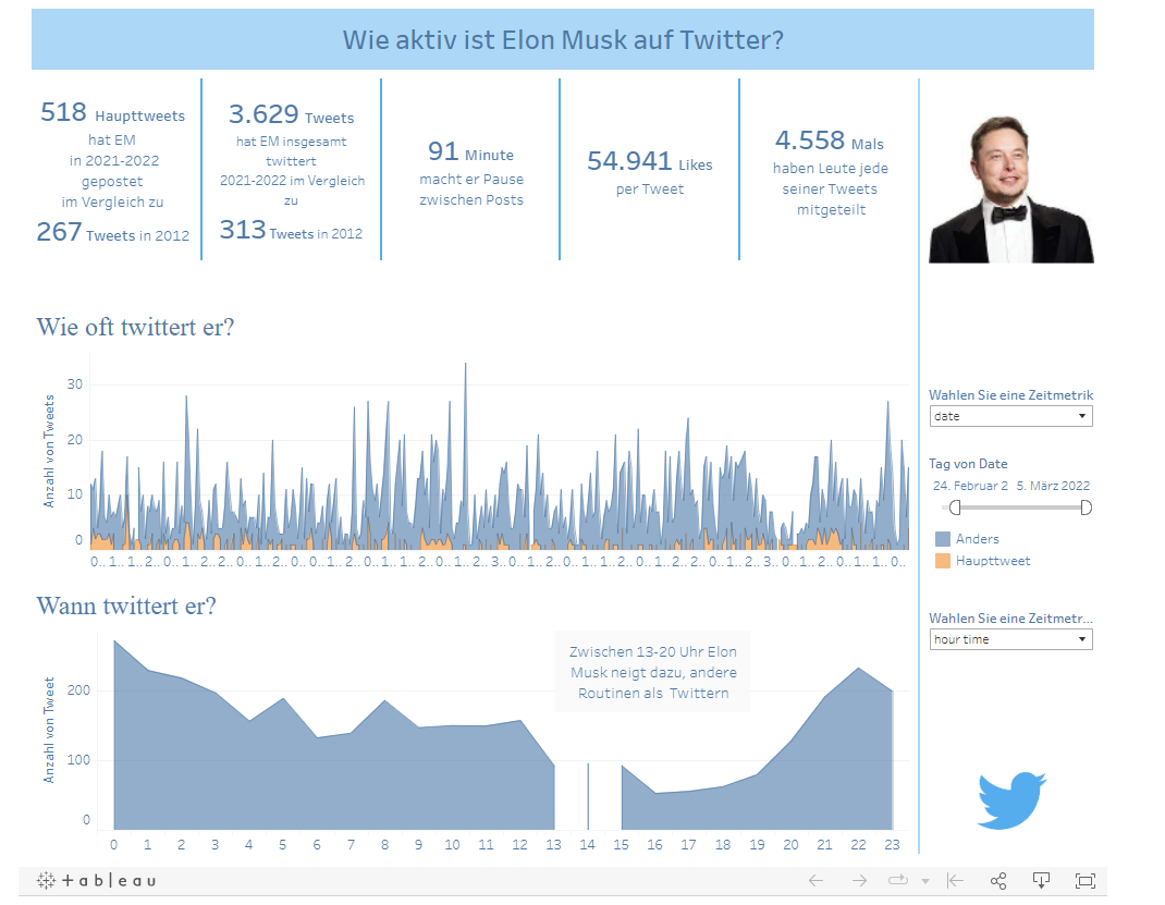Shifting focus to Elon’s Musk tweeting habits, I come up with a few questions for the dashboard. How active is Elon Musk in Twitter? How often does he tweet? How regular does he tweet during the week?