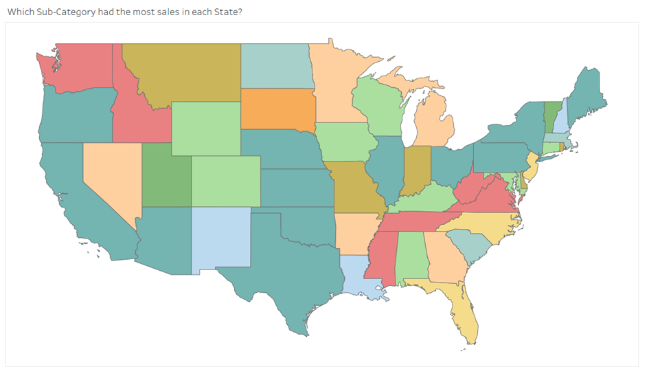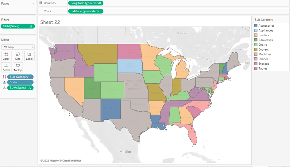 Using the familiar dataset Superstore Sales, then I create a map card and drag State into Details, and Subcategory into Color.