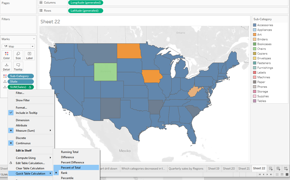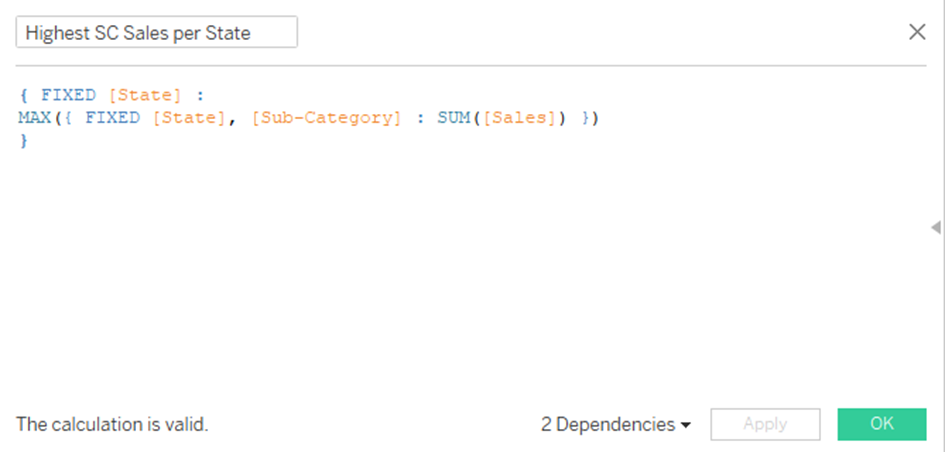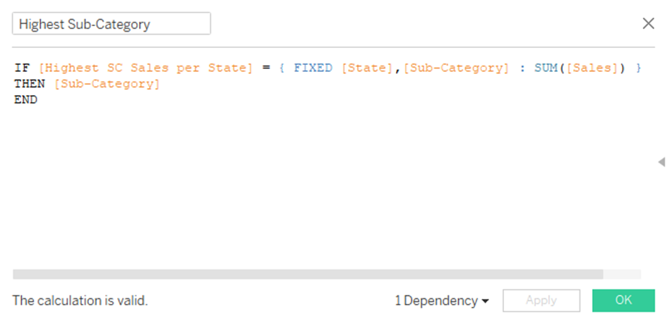 After that I will create another calculated field to return the sub-category having the highest sales for each state.
